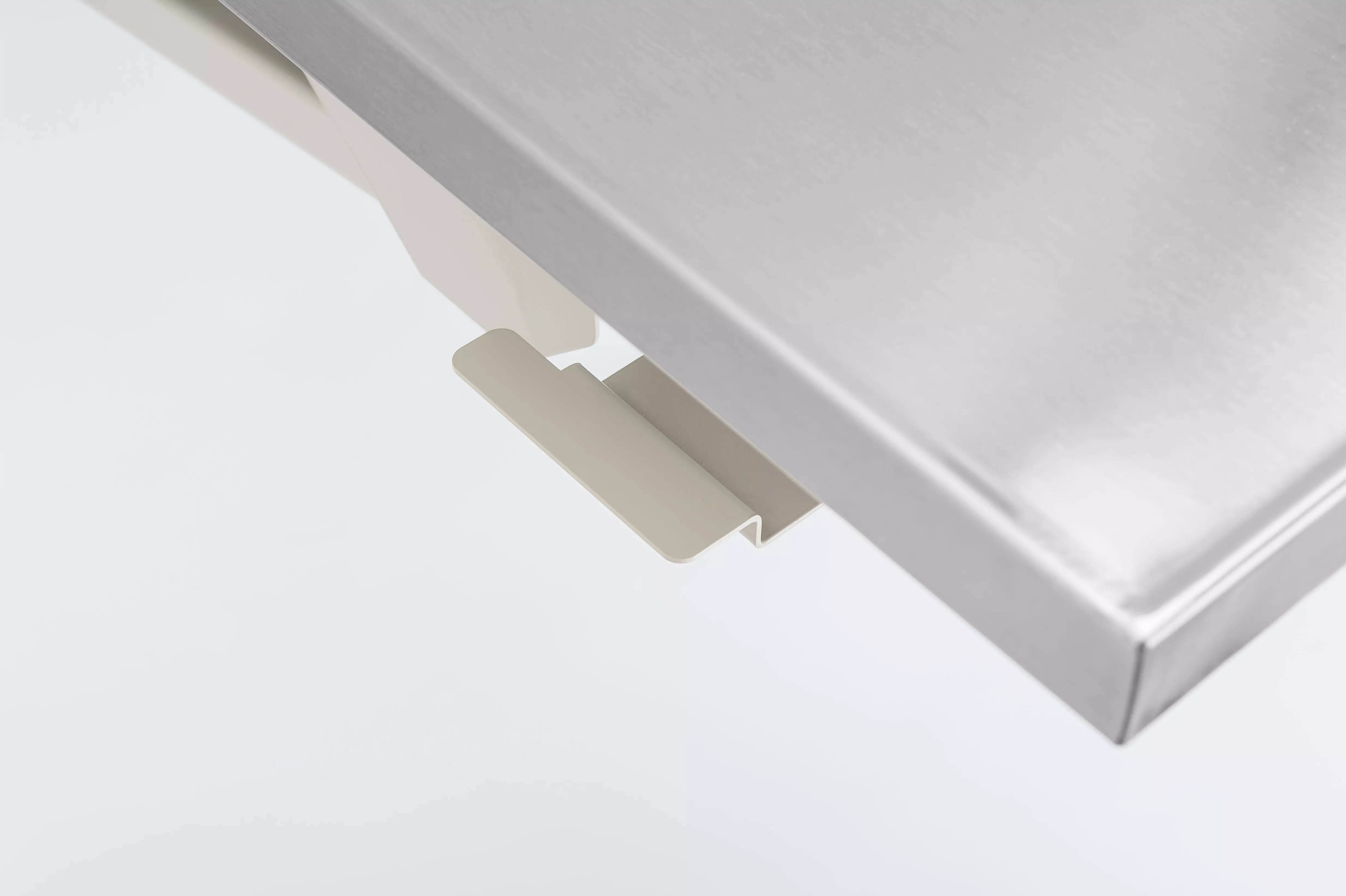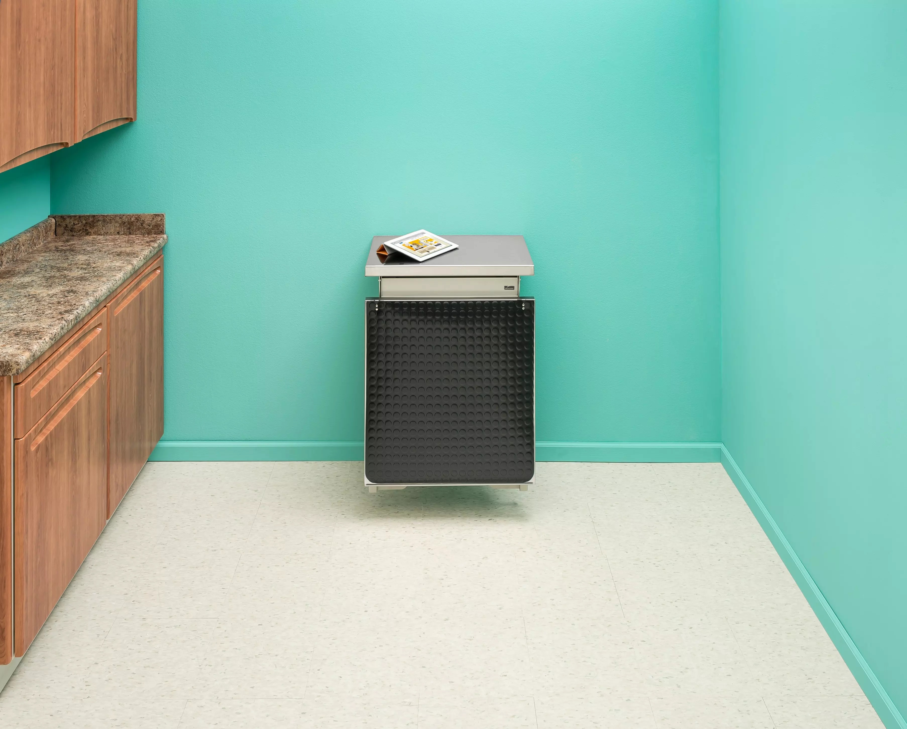 The unique fold-down design of the wall-mounted folding exam table features a stationary work surface perfect for charts, instruments and client education materials. Also, a special gas-assist lifting mechanism makes raising and loweing the table a breeze.